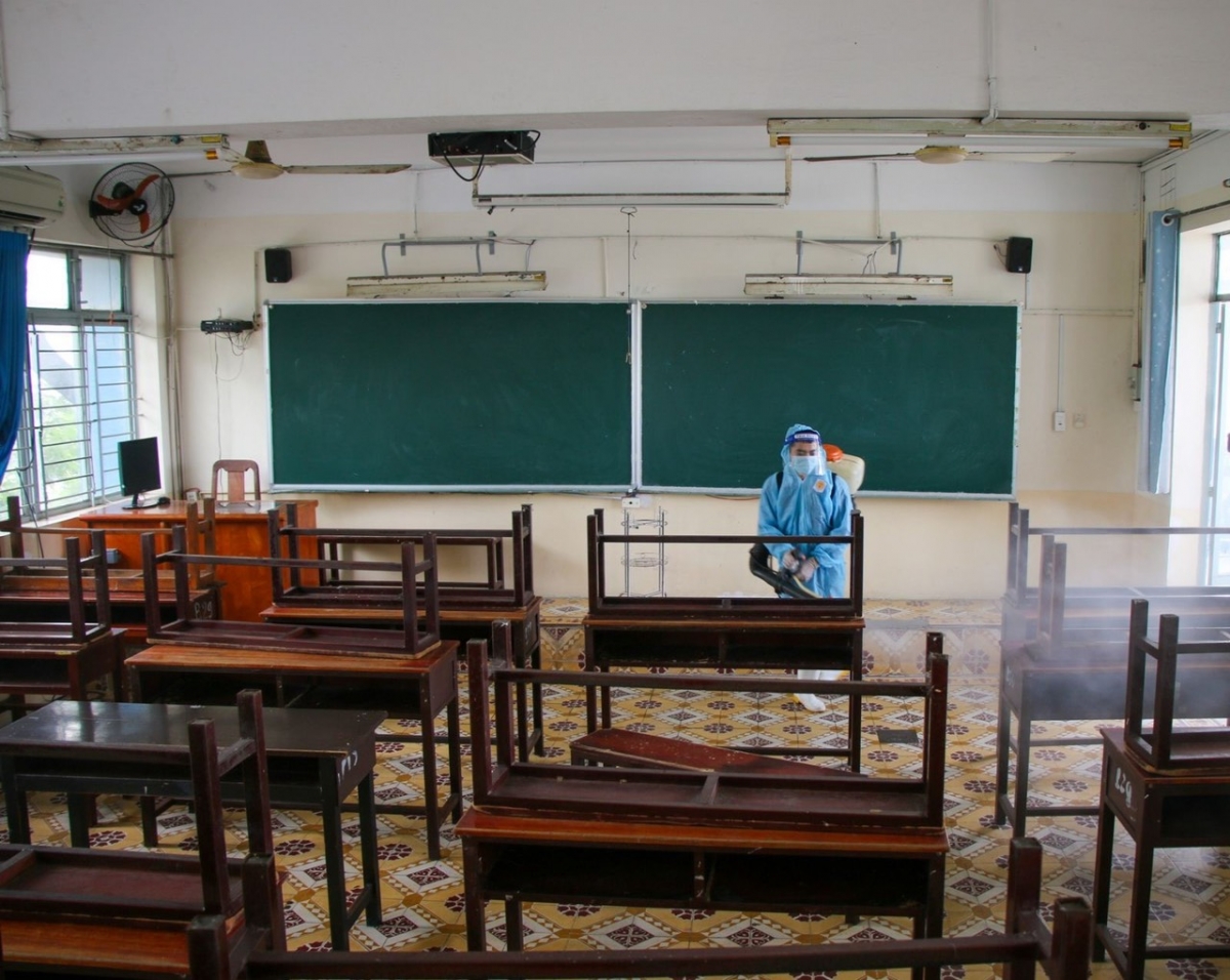 Trường THPT Nguyễn Du khử khuẩn ngày 1/12 để chuẩn bị đón học sinh quay trở lại (Ảnh: NTCC)